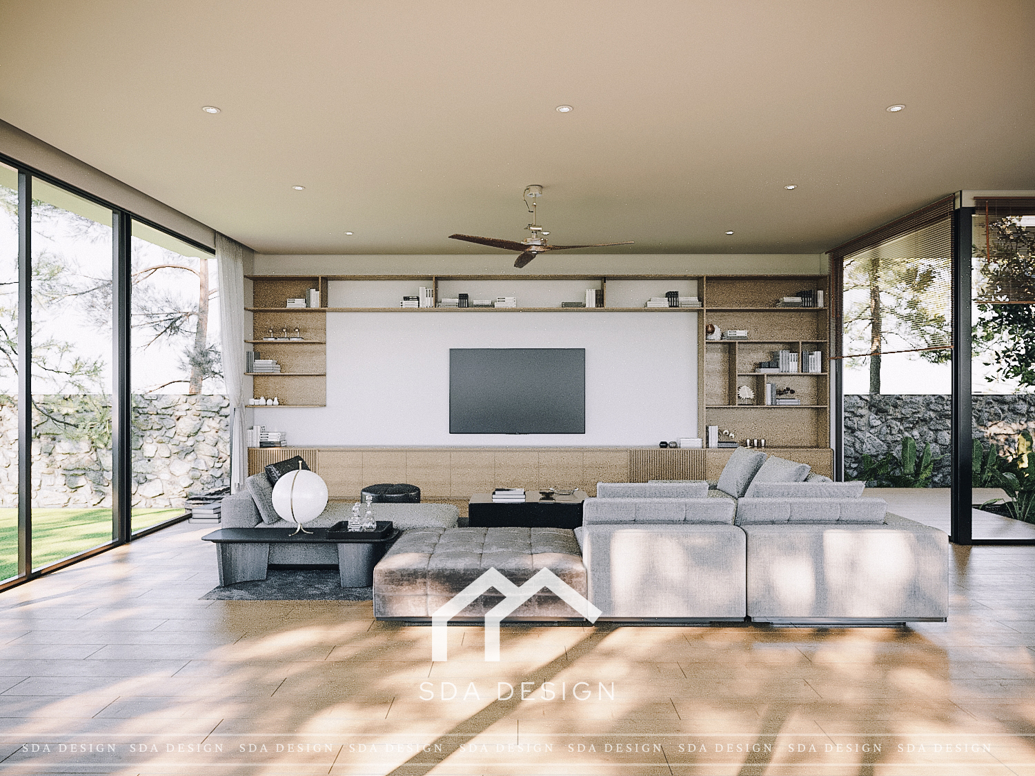 Phòng khách: Sử dụng tone màu trung tính kết hợp sofa rộng rãi, nội thất gỗ tự nhiên và cửa kính lớn hướng ra sân vườn.