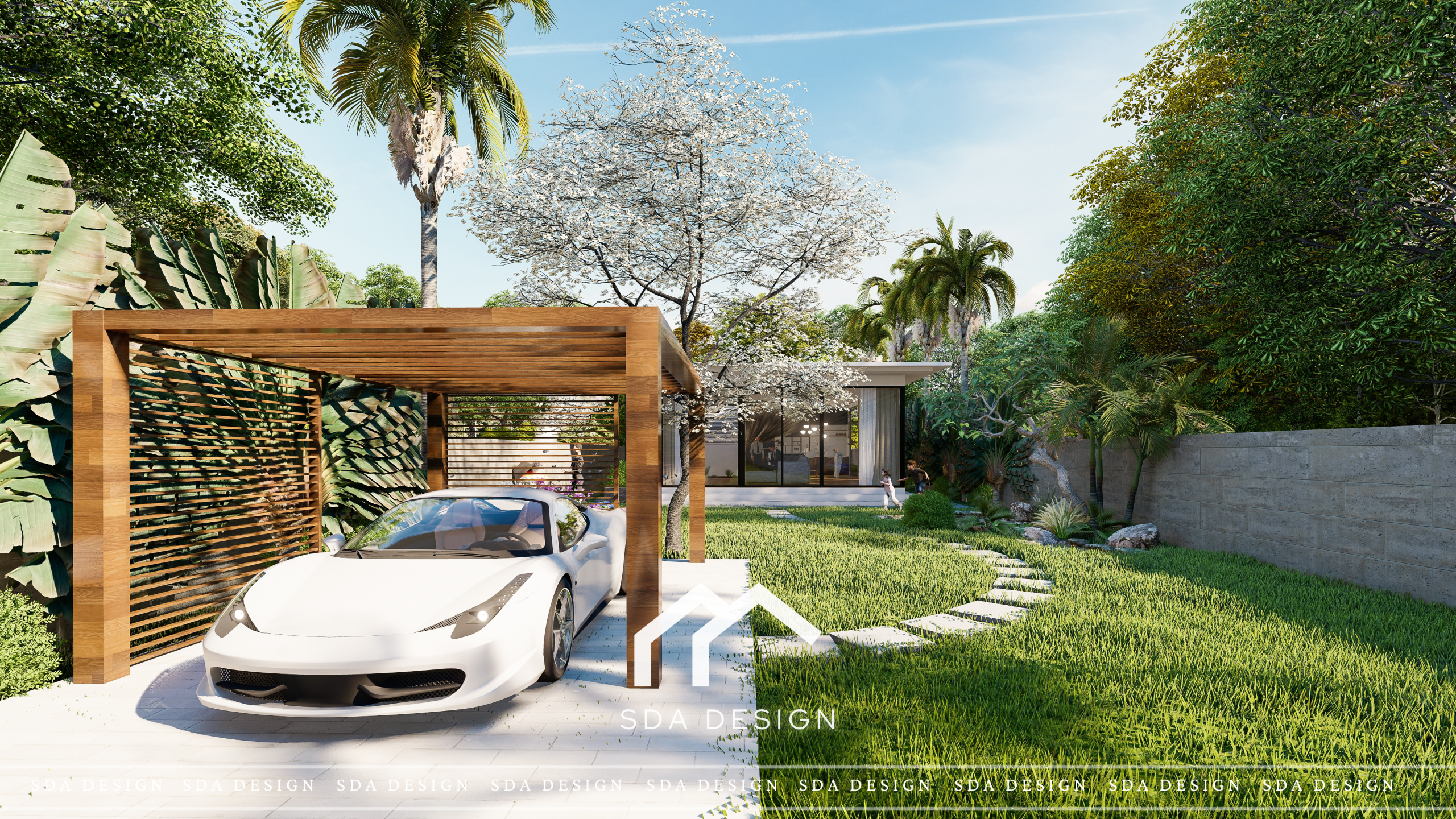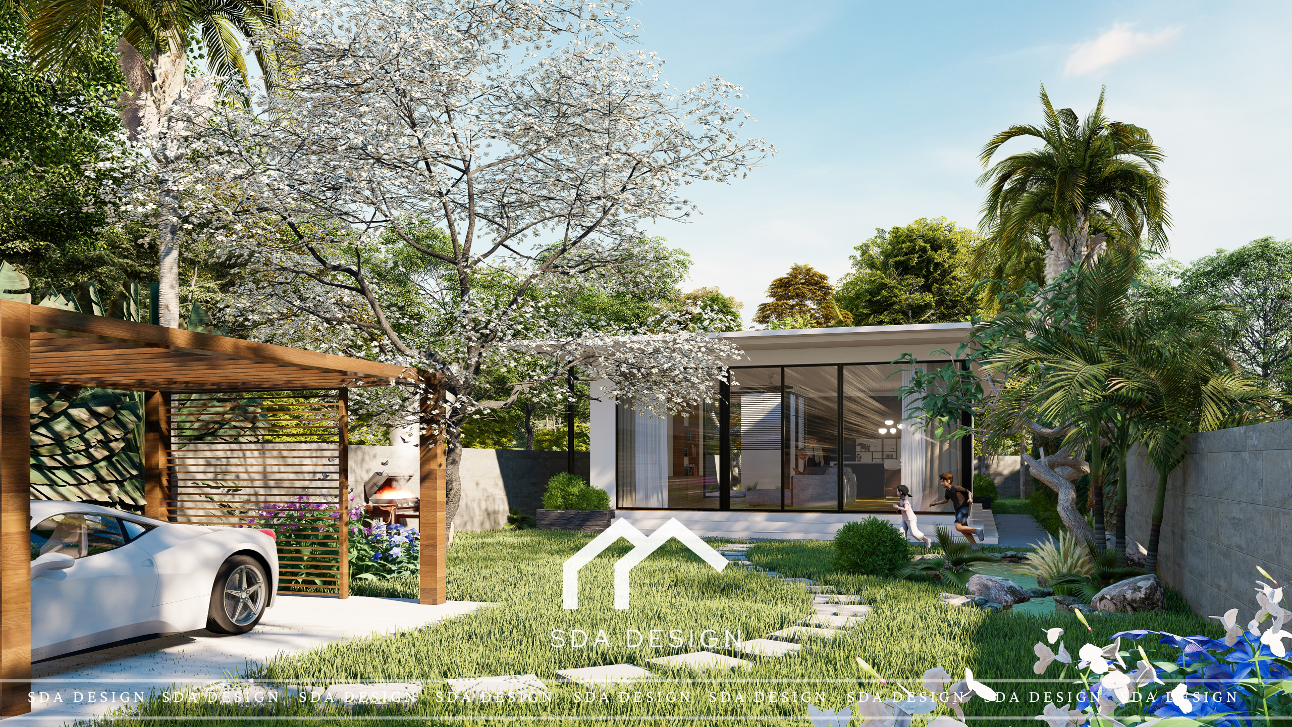Điểm đặc biệt của Mrs Hạnh House là khu vườn bao quanh với hồ nước nhỏ, lối đi lát đá và cây xanh tươi tốt. Thiết kế 3D thể hiện rõ bức tranh thiên nhiên thu nhỏ, tạo sự cân bằng giữa không gian sống và nghỉ dưỡng.