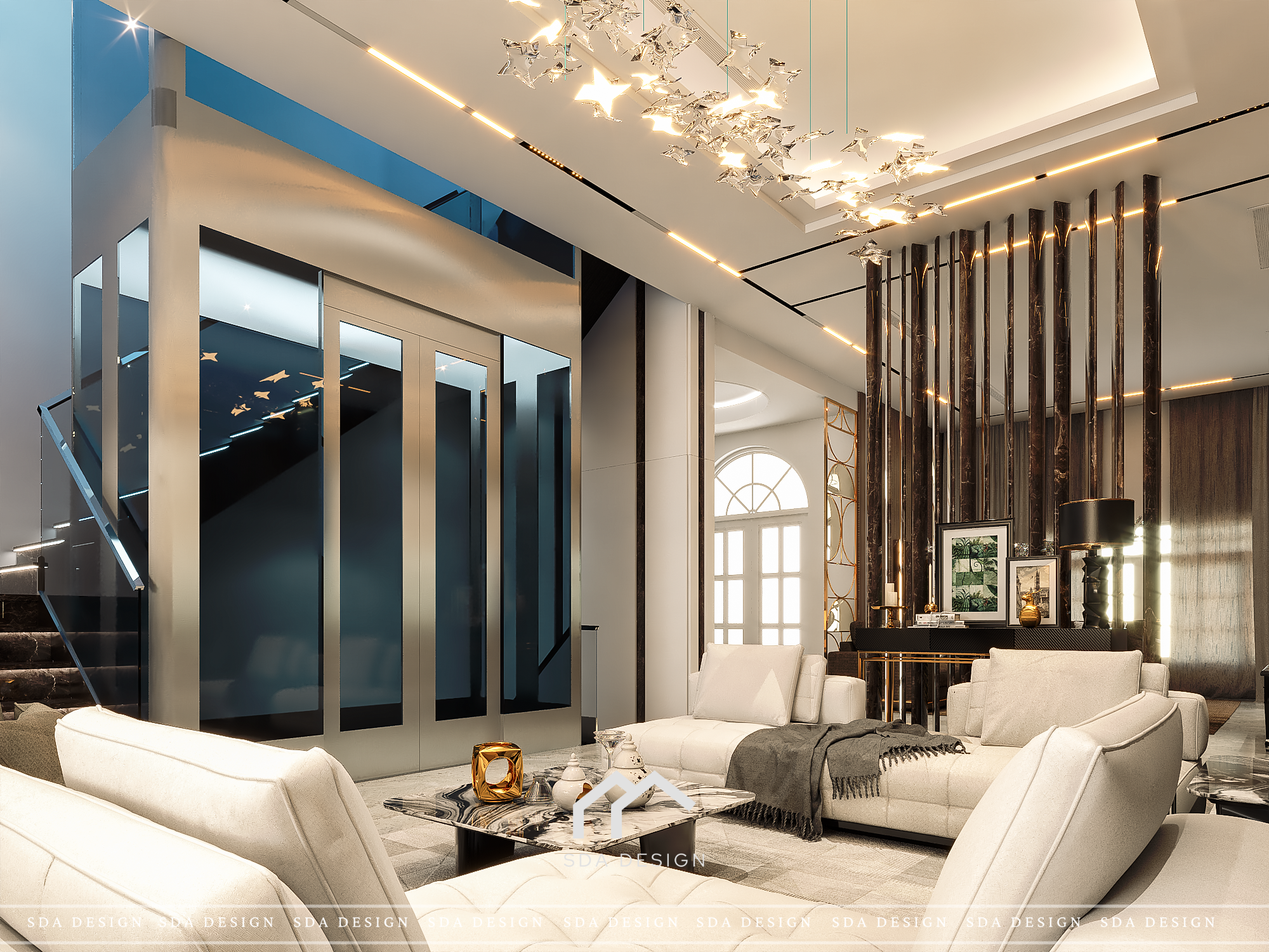 Không gian phòng khách Lilly House được bao phủ bởi tone màu trung tính hiện đại, nổi bật trên nền đá vân mây tự nhiên. Bộ sofa cao cấp kết hợp bàn trà đá cùng hệ thống ánh sáng hắt trần và đèn trang trí tinh xảo, tạo nên một không gian tiếp khách vừa ấm cúng vừa sang trọng.