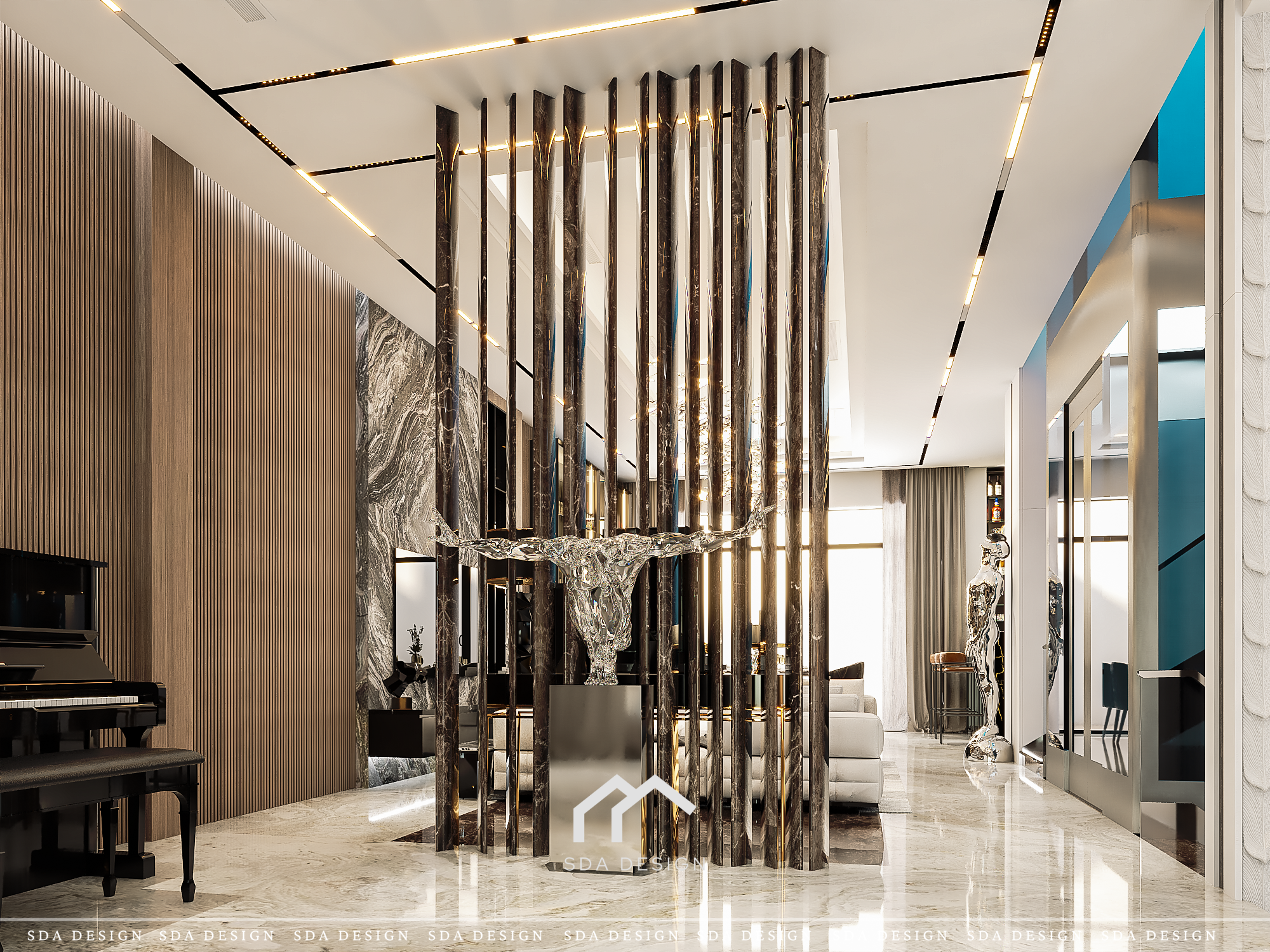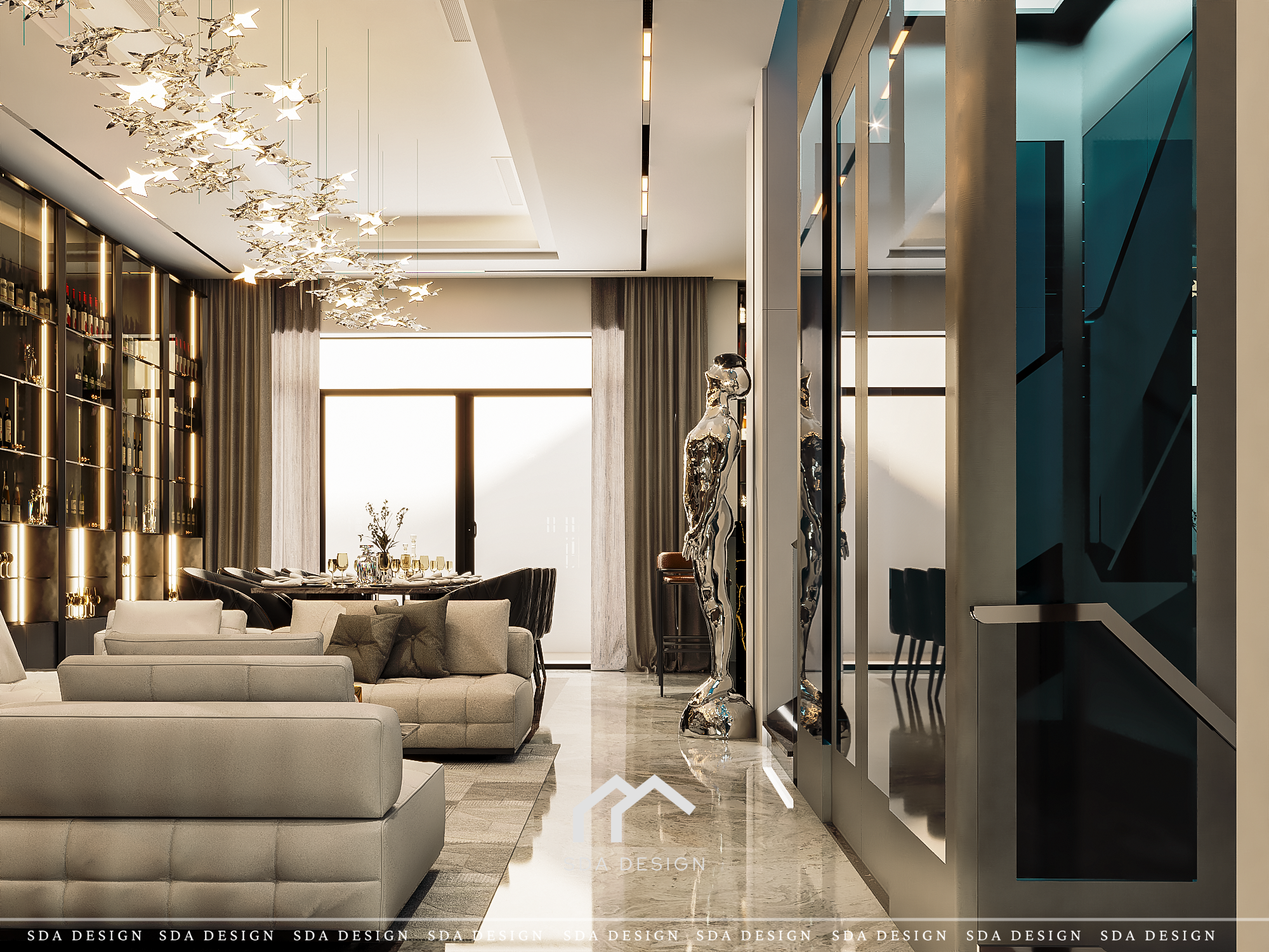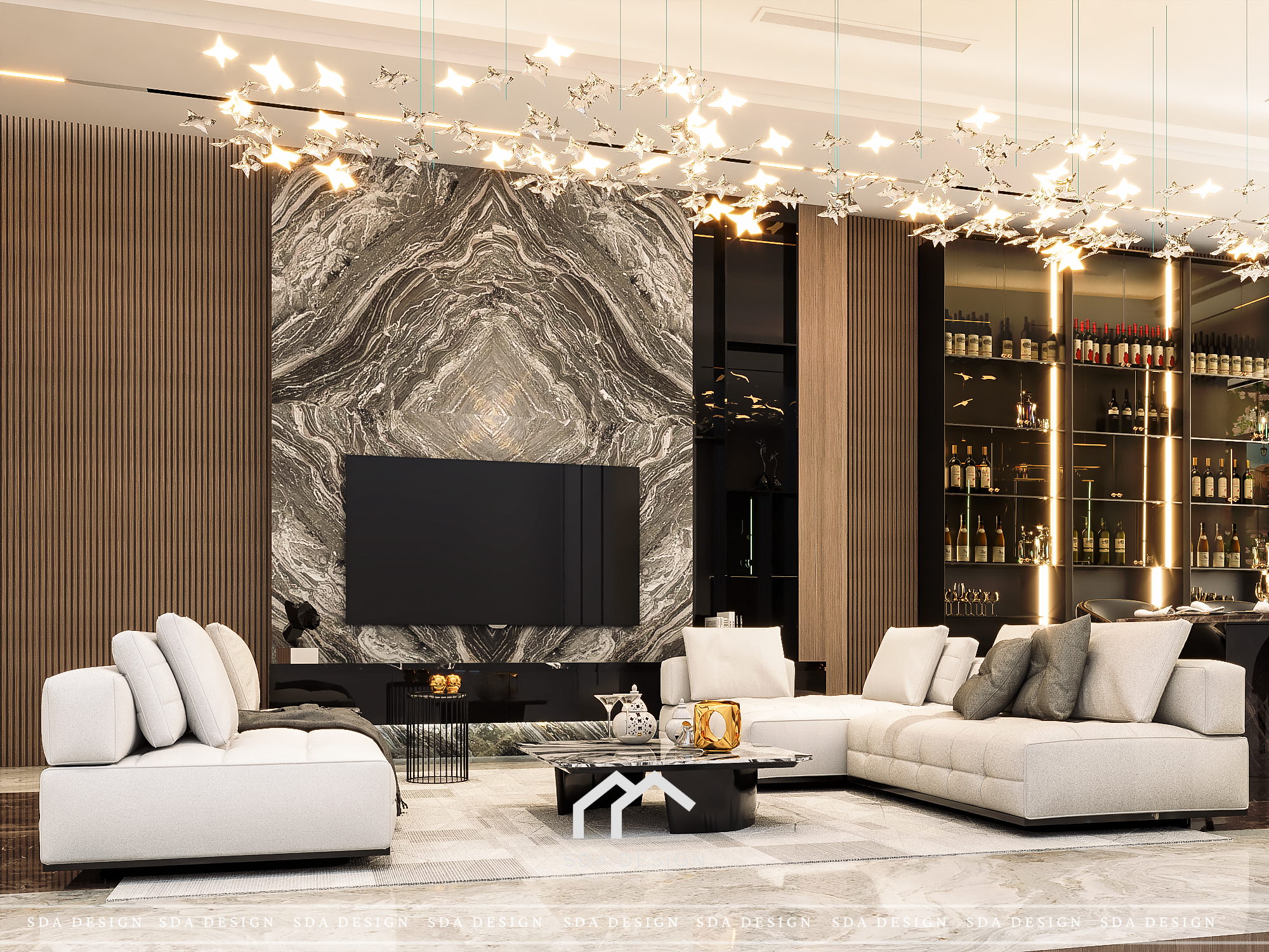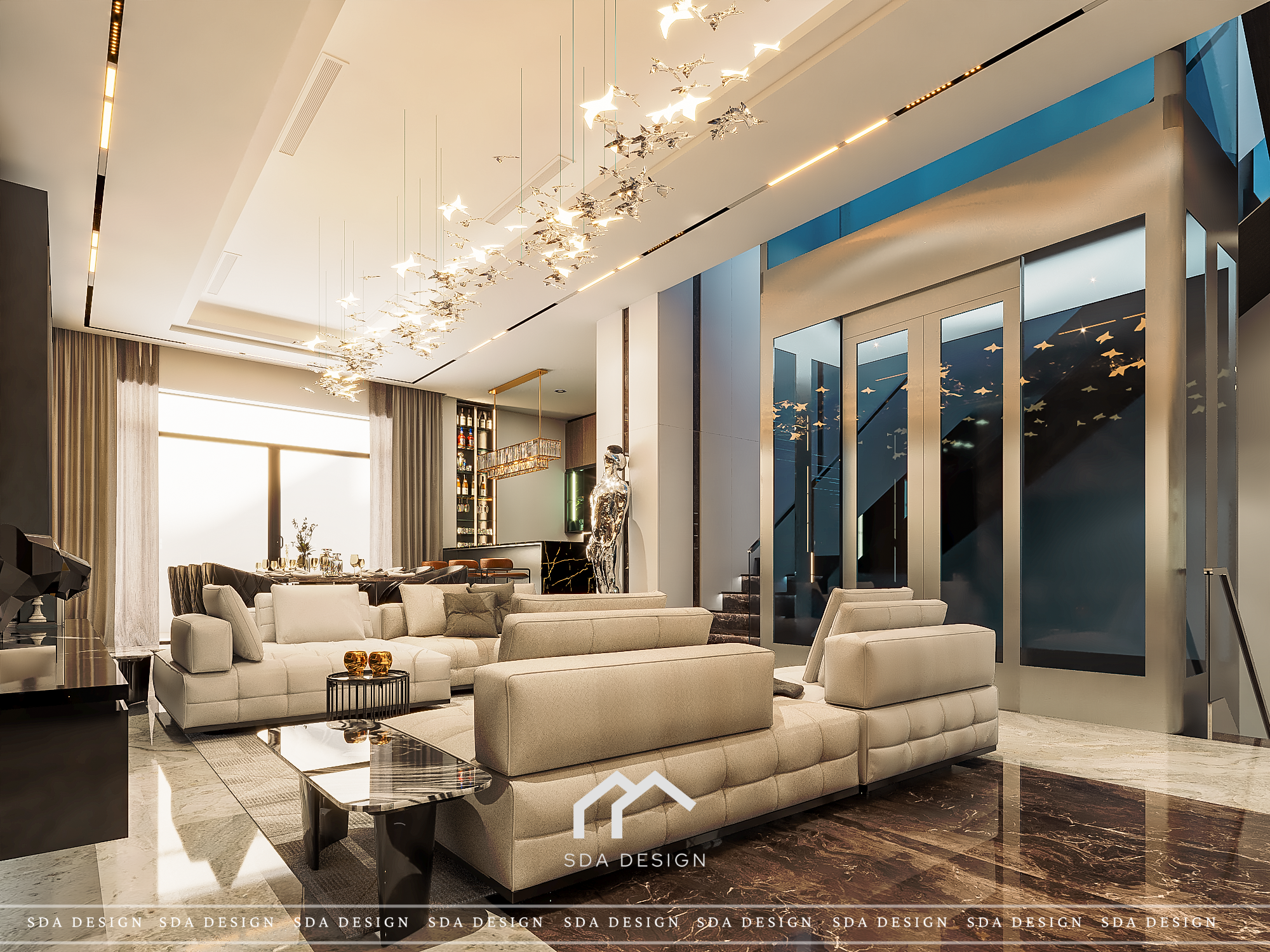 Không gian phòng khách Lilly House được bao phủ bởi tone màu trung tính hiện đại, nổi bật trên nền đá vân mây tự nhiên. Bộ sofa cao cấp kết hợp bàn trà đá cùng hệ thống ánh sáng hắt trần và đèn trang trí tinh xảo, tạo nên một không gian tiếp khách vừa ấm cúng vừa sang trọng.