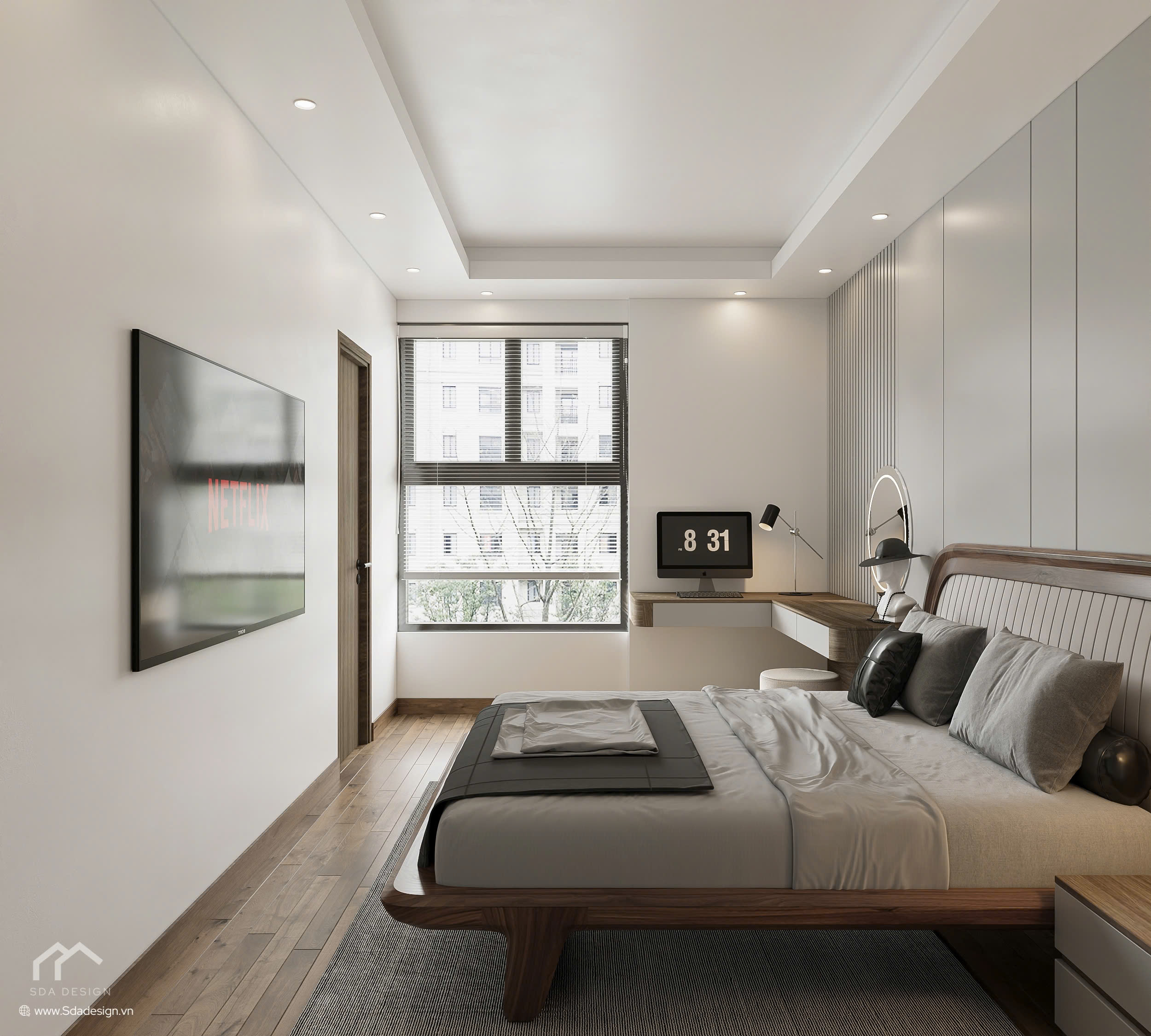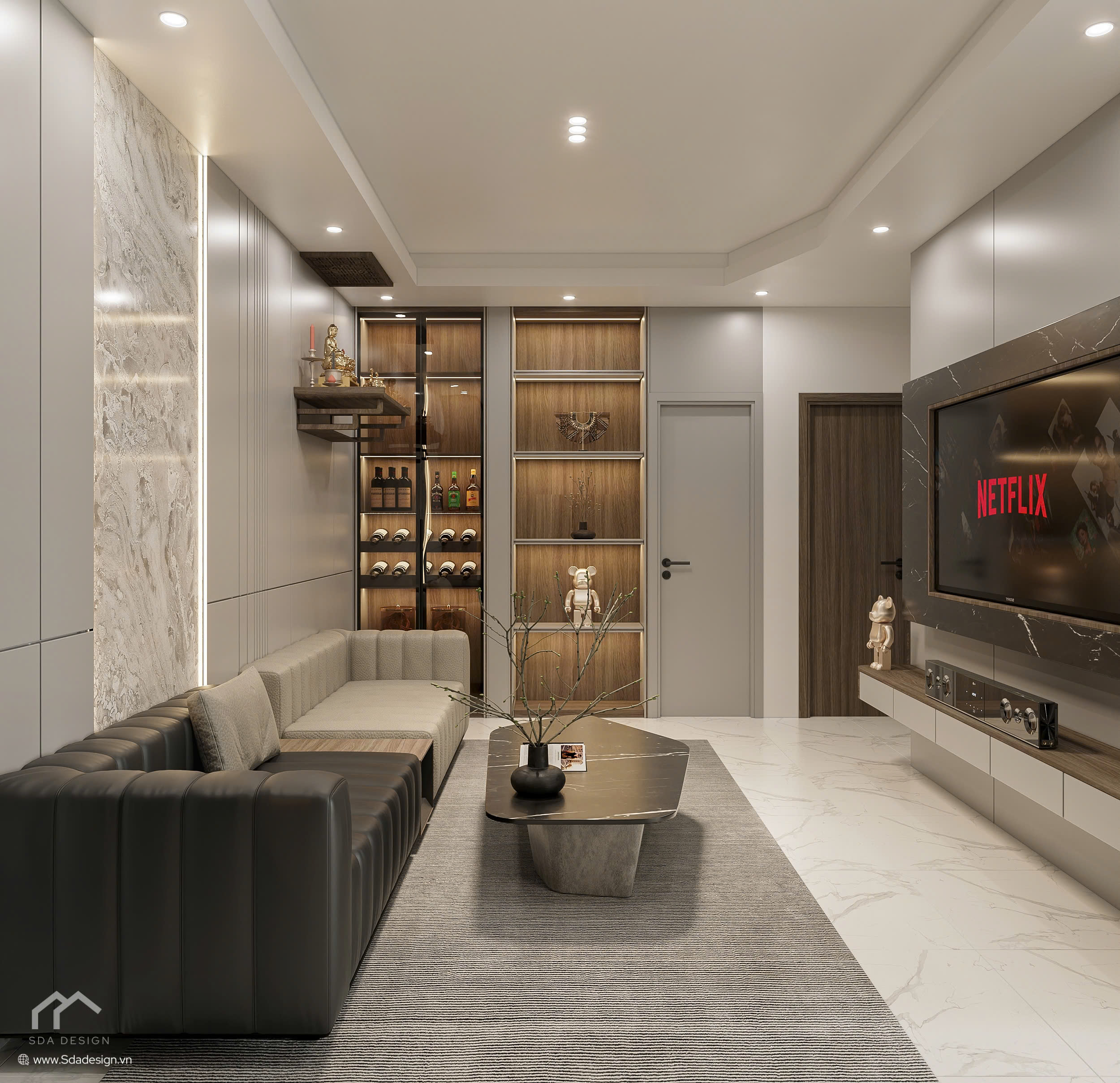 Thiết kế nội thất chung cư với tông màu ghi, trắng và gỗ không chỉ tạo cảm giác thanh lịch mà còn mang lại không gian sống thoải mái, dễ chịu. Sự kết hợp này giúp căn hộ trở nên nổi bật và tinh tế.