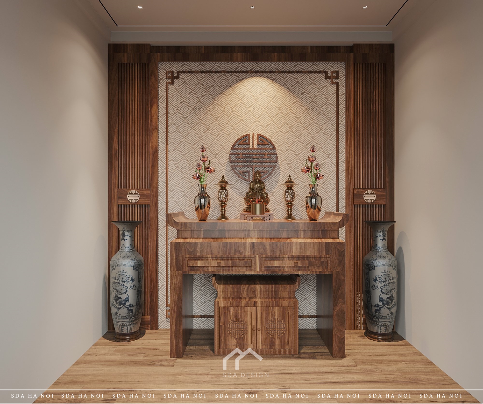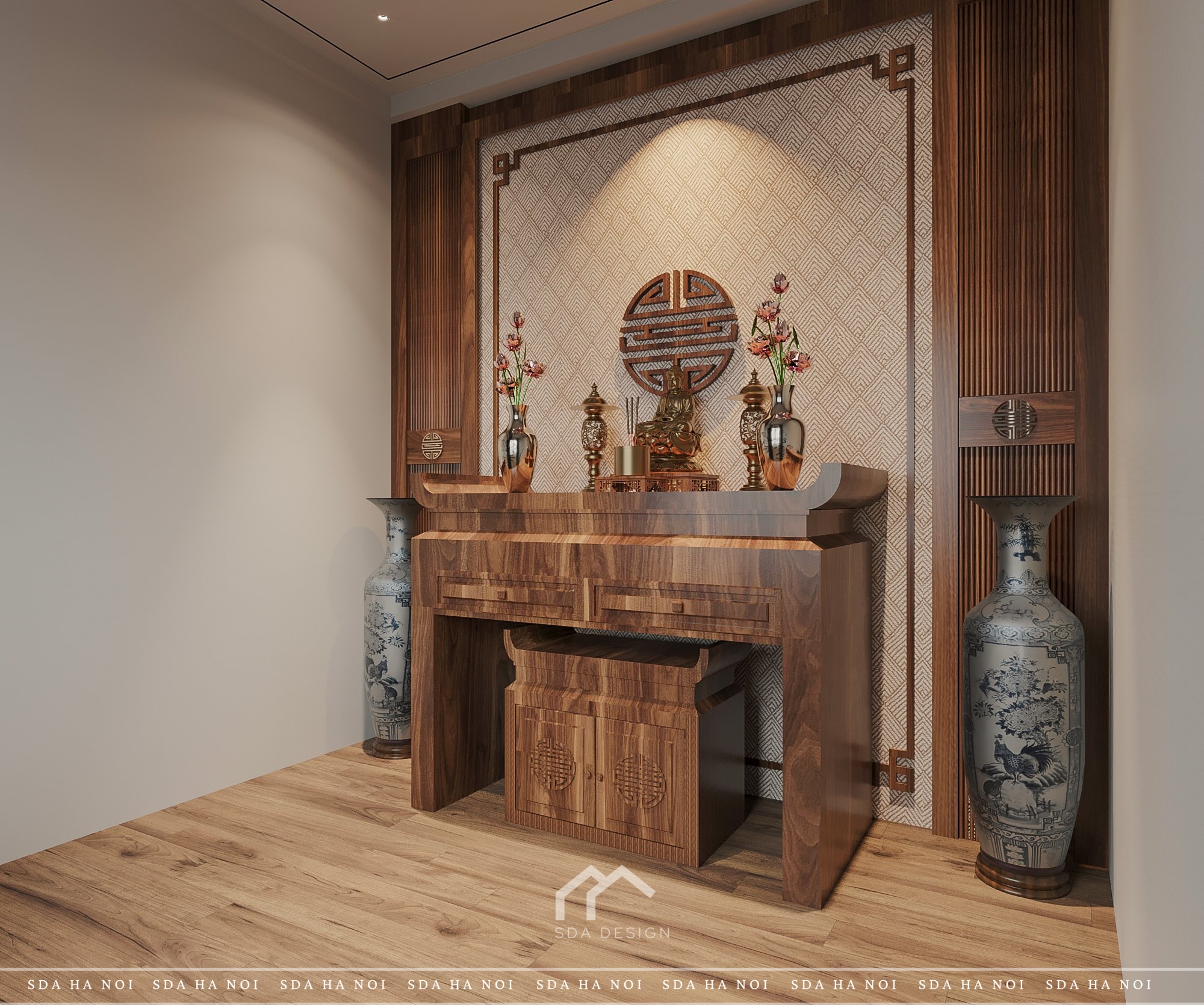 Không gian phòng thờ được thiết kế riêng biệt với nội thất gỗ tự nhiên tinh xảo, hoa văn trang nhã, mang lại sự linh thiêng và gắn kết giá trị truyền thống gia đình.