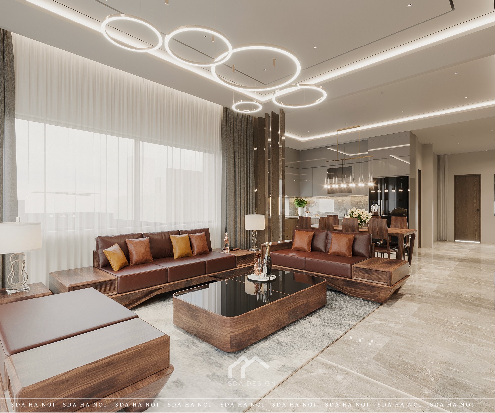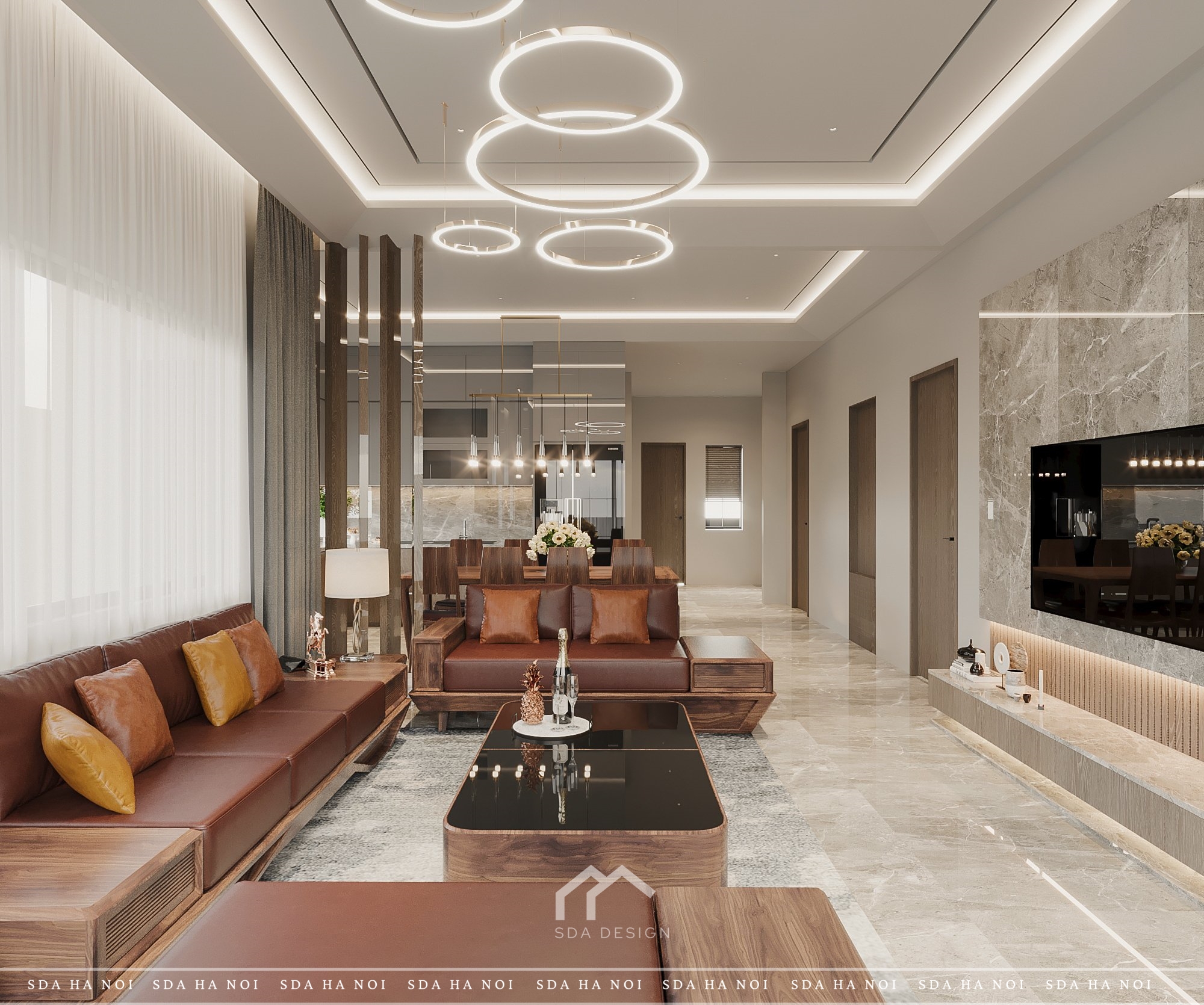 Phòng khách được thiết kế với bộ sofa gỗ kết hợp nệm da cao cấp, gam màu nâu – be ấm áp, kết hợp cùng hệ trần thạch cao giật cấp và đèn LED hắt trần hiện đại. Điểm nhấn là bộ đèn trần nghệ thuật hình vòng tròn, tạo sự sang trọng và thu hút. Không gian mở kết nối trực tiếp với bếp – bàn ăn, mang lại sự tiện nghi và cảm giác rộng thoáng.