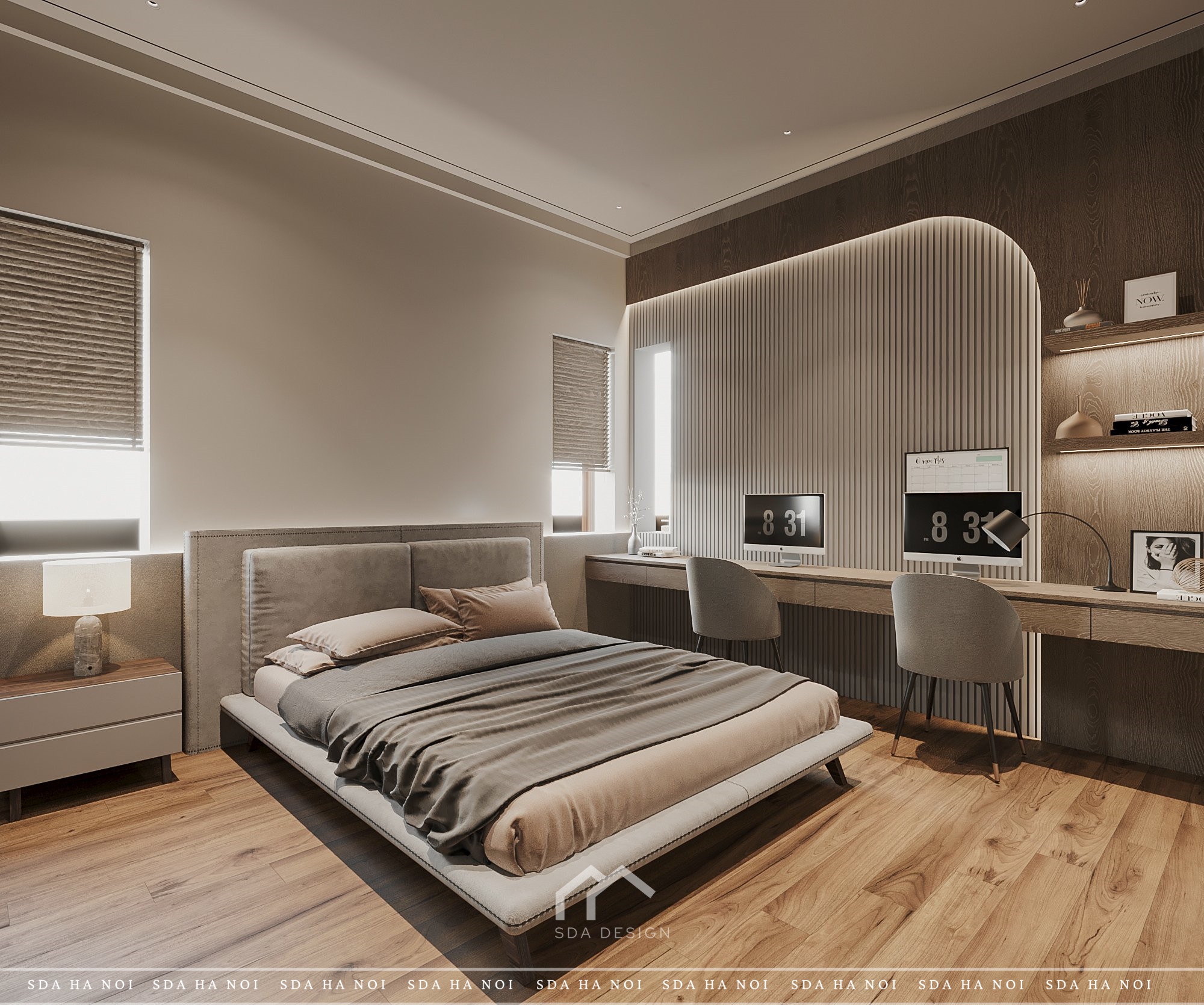 • Bàn trang điểm và bàn học được bố trí khoa học, tận dụng tối đa ánh sáng tự nhiên từ cửa sổ. Gam màu trung tính như be, xám, nâu gỗ chủ đạo giúp căn phòng vừa hiện đại vừa dễ chịu cho giấc ngủ ngon.