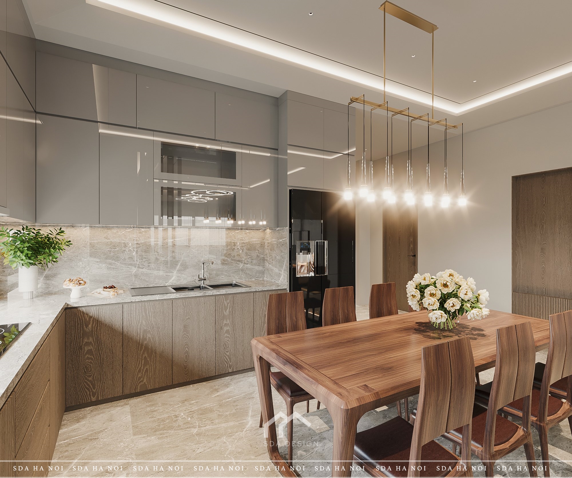 Khu vực bếp được bố trí tủ bếp chữ L, sử dụng gỗ công nghiệp chống ẩm phủ acrylic bóng gương kết hợp đá tự nhiên, tạo sự sang trọng và dễ vệ sinh. Bàn ăn gỗ nguyên khối kết hợp ghế tựa bọc nệm mang đến không gian ấm cúng, thuận tiện cho những bữa cơm sum vầy.