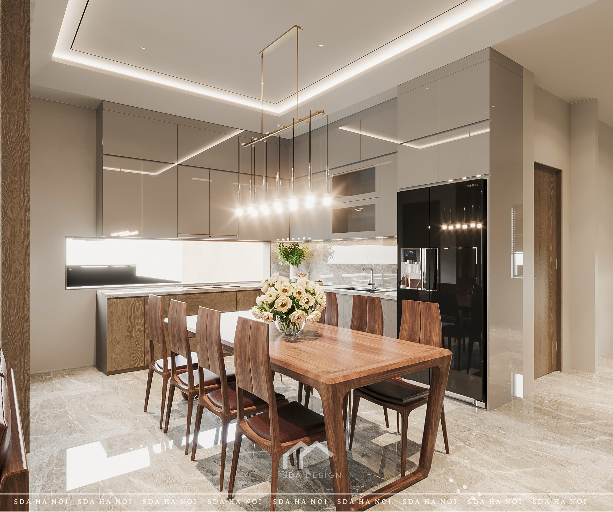 Khu vực bếp được bố trí tủ bếp chữ L, sử dụng gỗ công nghiệp chống ẩm phủ acrylic bóng gương kết hợp đá tự nhiên, tạo sự sang trọng và dễ vệ sinh. Bàn ăn gỗ nguyên khối kết hợp ghế tựa bọc nệm mang đến không gian ấm cúng, thuận tiện cho những bữa cơm sum vầy.