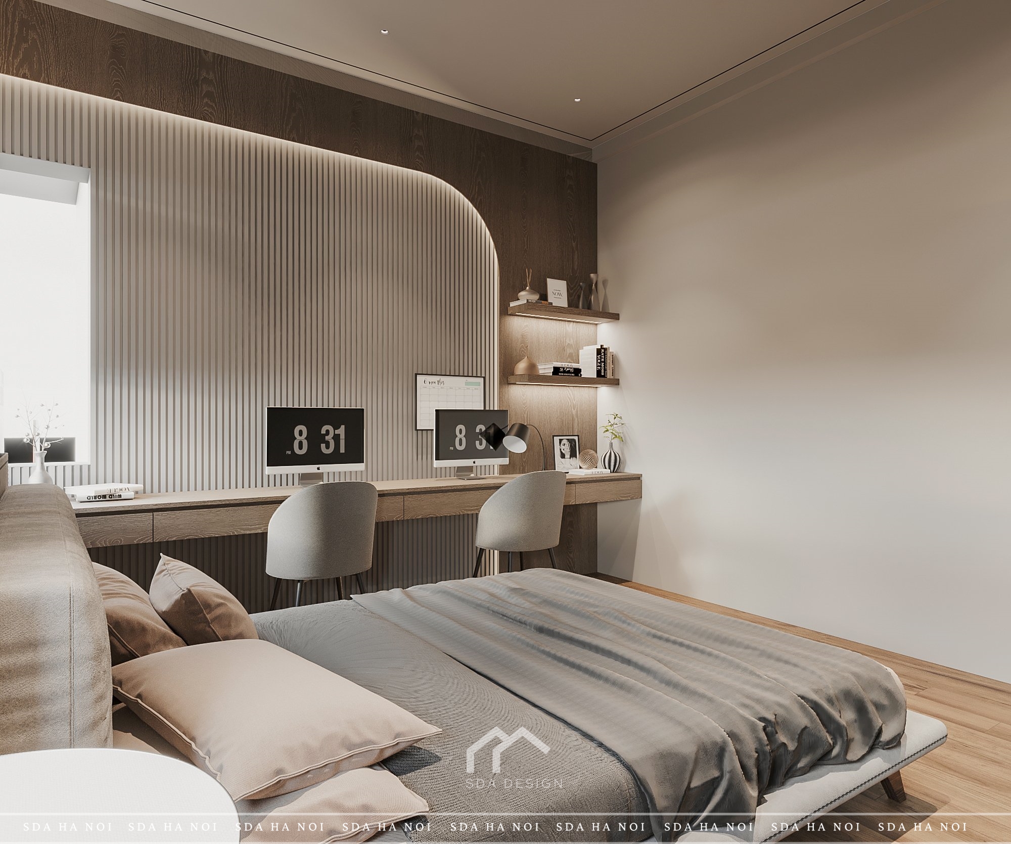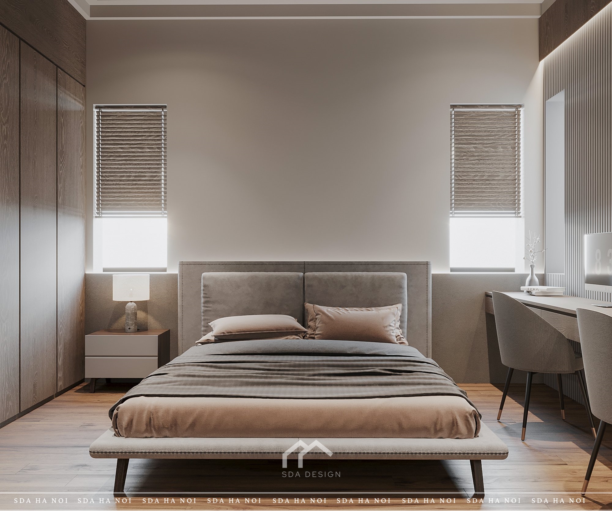 • Bàn trang điểm và bàn học được bố trí khoa học, tận dụng tối đa ánh sáng tự nhiên từ cửa sổ. Gam màu trung tính như be, xám, nâu gỗ chủ đạo giúp căn phòng vừa hiện đại vừa dễ chịu cho giấc ngủ ngon.