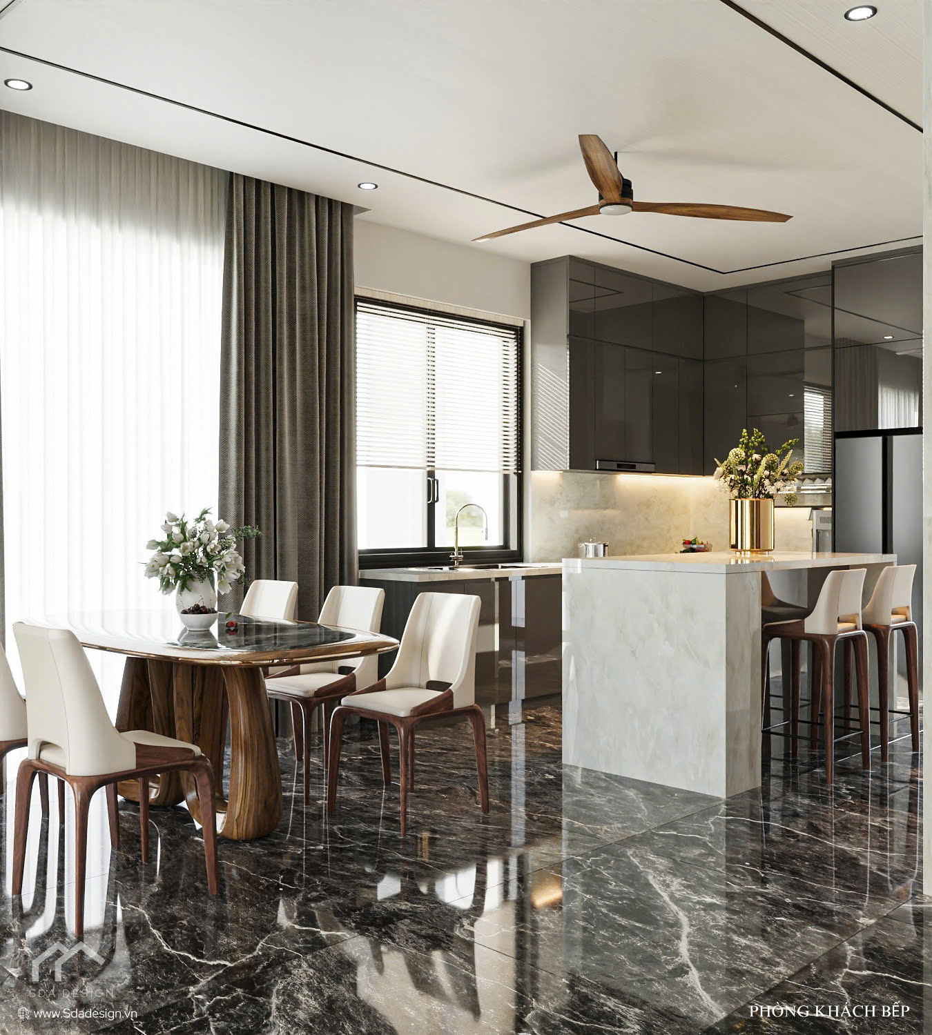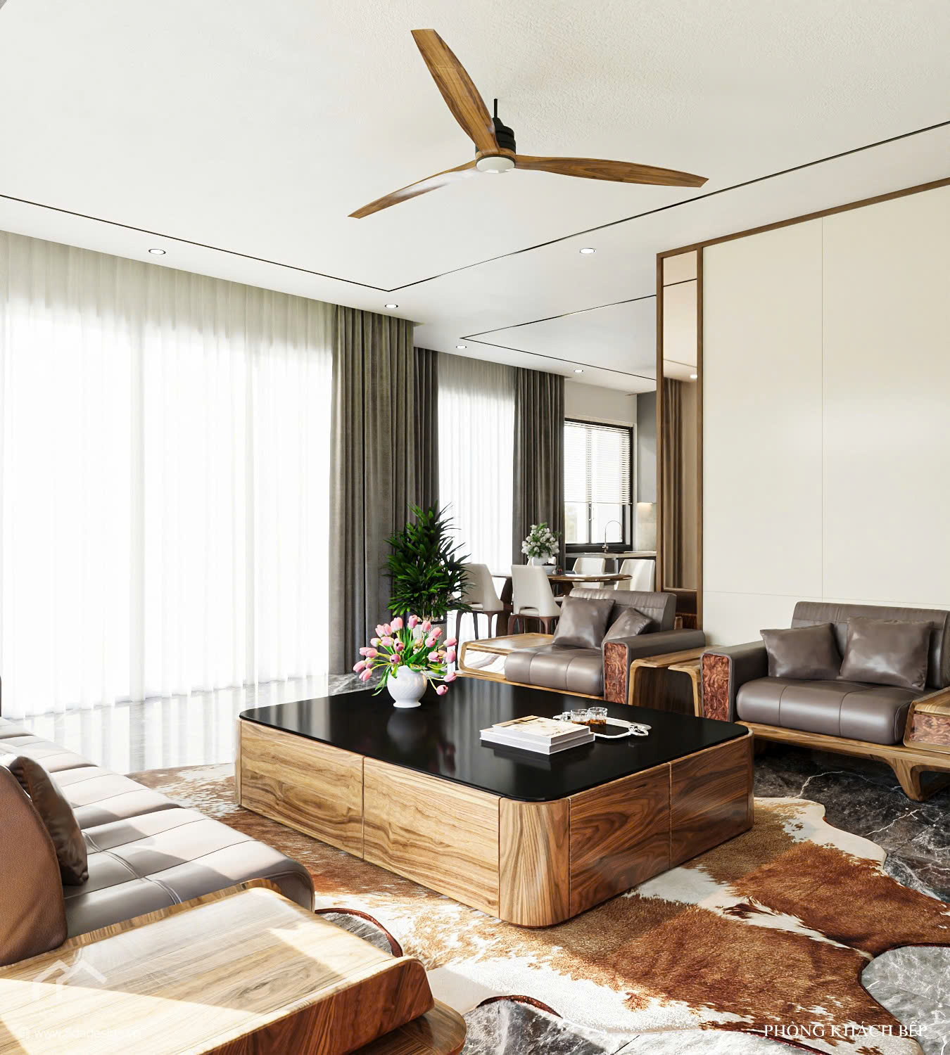 Phòng khách được thiết kế mở, liên kết với bếp ăn, tạo cảm giác rộng rãi và gắn kết. Bộ sofa da cao cấp phối cùng bàn trà gỗ tự nhiên mang lại vẻ đẹp gần gũi mà vẫn hiện đại. Trần thạch cao phẳng cùng hệ đèn âm trần và quạt trần gỗ vừa đảm bảo ánh sáng, vừa làm điểm nhấn thẩm mỹ.