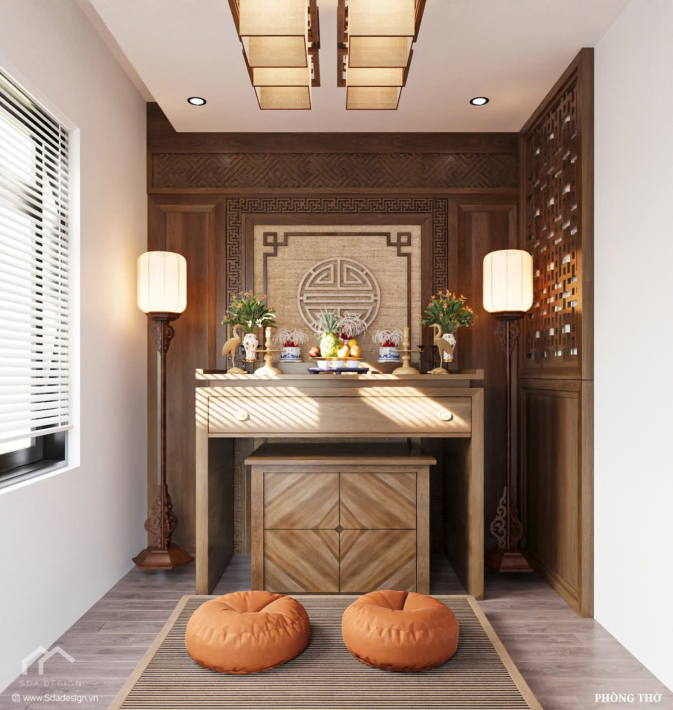 Phòng thờ trong nhà Mr. Chính được thiết kế với chất liệu gỗ tự nhiên chủ đạo, tạo cảm giác trang trọng và ấm áp. Bàn thờ đơn giản, tinh tế, kết hợp hoa văn truyền thống và hệ đèn trang trí hai bên, mang lại sự tôn nghiêm nhưng không kém phần hài hòa với tổng thể căn nhà. Đây là không gian để gia chủ tưởng nhớ tổ tiên và giữ gìn nét đẹp văn hóa tâm linh của người Việt.