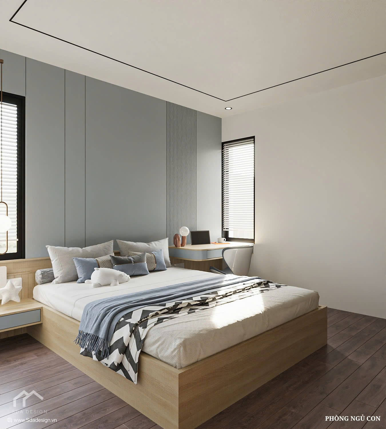 Phòng ngủ con được thiết kế đơn giản, nội thất gọn gàng với tủ quần áo kịch trần, giường ngủ kết hợp ngăn kéo lưu trữ. Bàn học nhỏ gọn bố trí cạnh cửa sổ, tận dụng ánh sáng tự nhiên, tạo không gian học tập thoải mái cho trẻ.