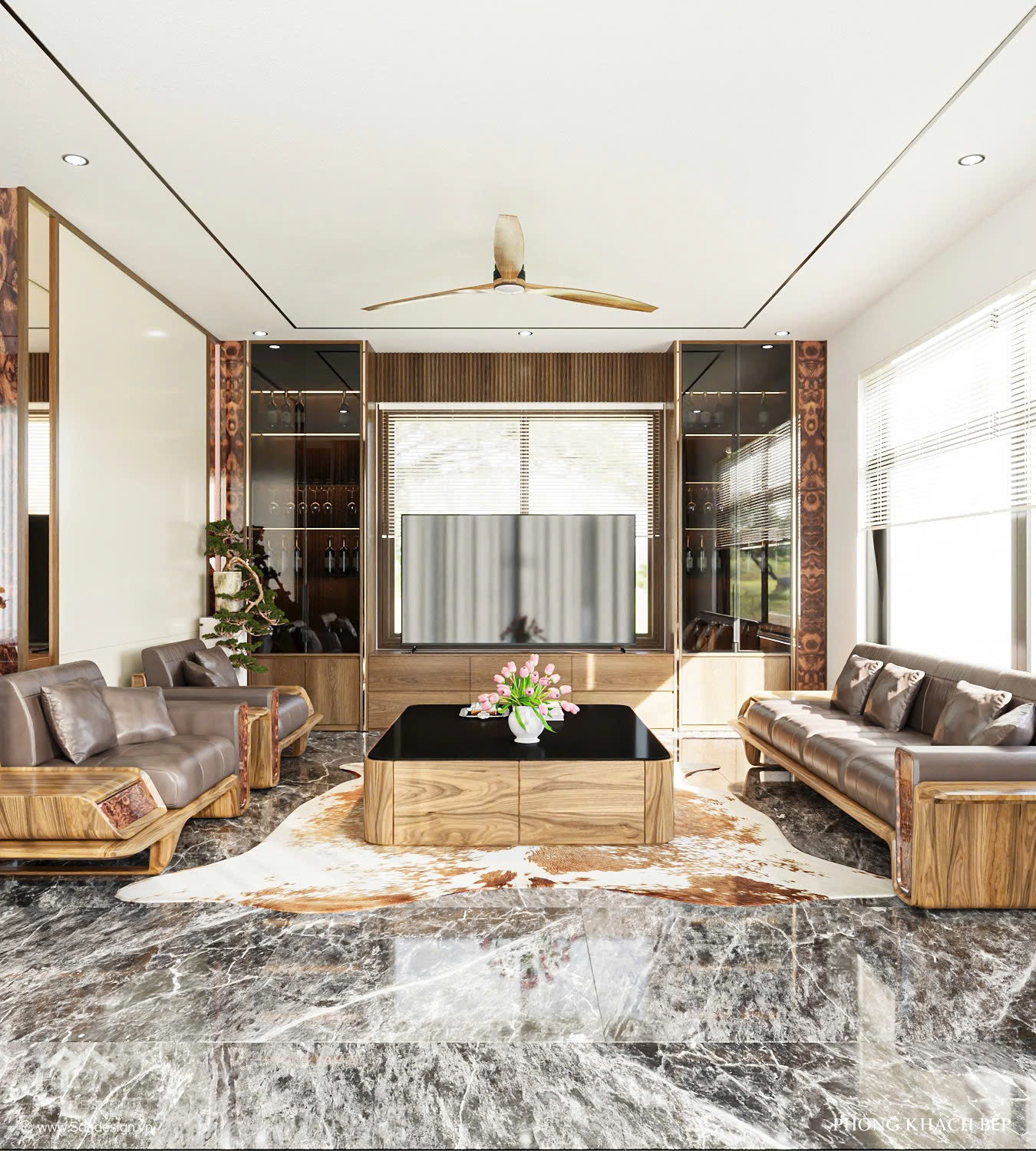 Phòng khách được thiết kế mở, liên kết với bếp ăn, tạo cảm giác rộng rãi và gắn kết. Bộ sofa da cao cấp phối cùng bàn trà gỗ tự nhiên mang lại vẻ đẹp gần gũi mà vẫn hiện đại. Trần thạch cao phẳng cùng hệ đèn âm trần và quạt trần gỗ vừa đảm bảo ánh sáng, vừa làm điểm nhấn thẩm mỹ.