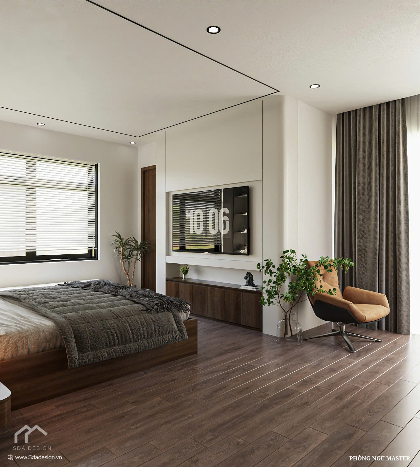Phòng ngủ master mang tone màu trung tính chủ đạo, kết hợp sàn gỗ nâu và hệ tủ kịch trần giúp tối ưu không gian lưu trữ. Giường ngủ gỗ MDF phủ veneer tự nhiên đi cùng ga gối màu ghi xám nhẹ nhàng, tạo cảm giác thư giãn. Cửa sổ lớn đón ánh sáng tự nhiên, kết hợp rèm 2 lớp để điều chỉnh ánh sáng và đảm bảo sự riêng tư.