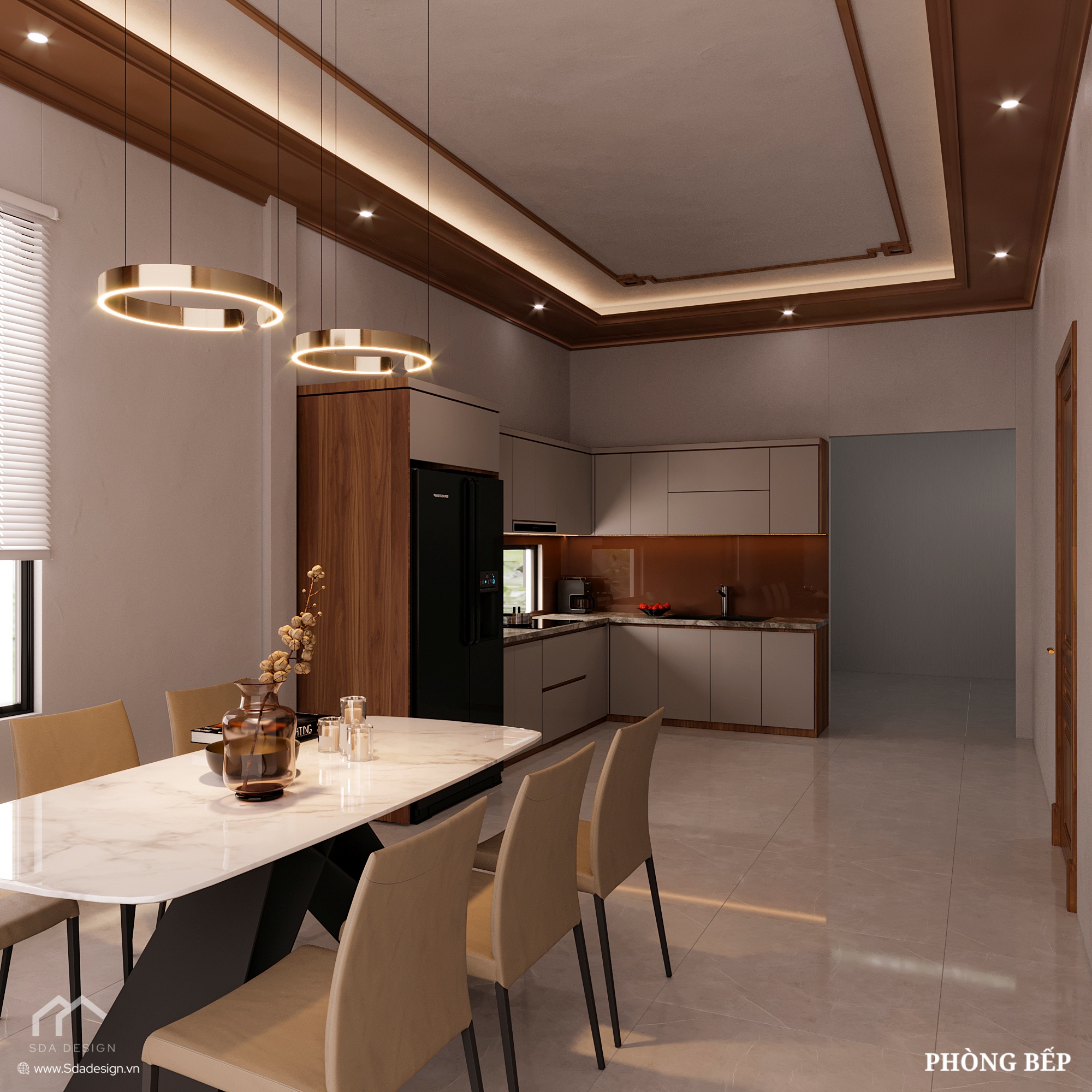 Mặt bếp ốp đá marble, tủ lạnh âm tường, và bàn ăn mặt đá trắng vân mây giúp không gian thêm hiện đại. Hệ thống đèn thả ánh vàng giúp bữa ăn thêm ấm cúng và tinh tế.