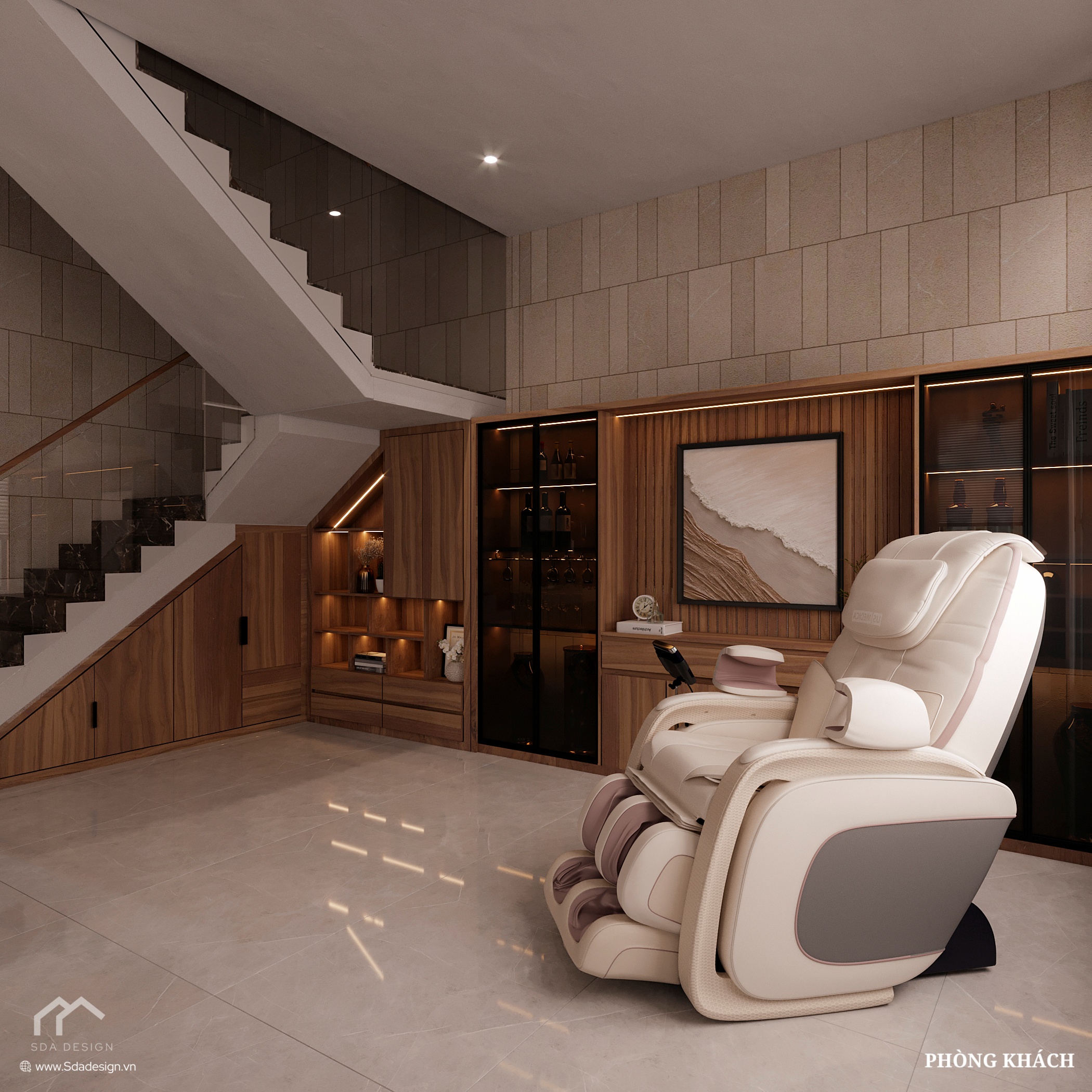 SDA Design khéo léo tận dụng khu vực gầm cầu thang làm tủ trang trí kết hợp kệ rượu, vừa tăng công năng lưu trữ vừa tạo điểm nhấn cho không gian. Sự kết hợp hài hòa giữa ánh sáng và chất liệu gỗ mang đến cảm giác ấm cúng, sang trọng.
